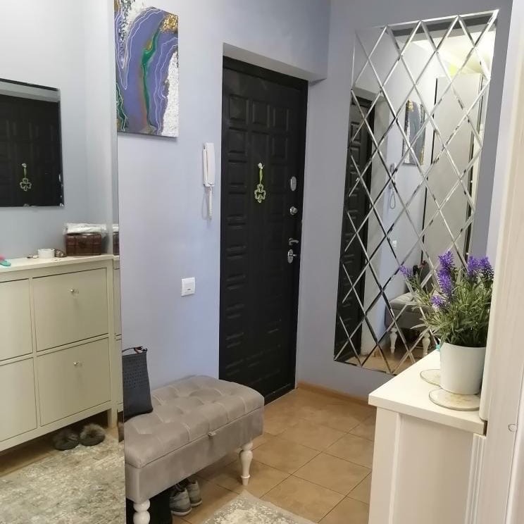 Зеркало в прихожей – это одновременно необходимость и классический прием оформления этой зоны. В этом случае прихожая оформлена в сдержанных лавандово-бежевых тонах.