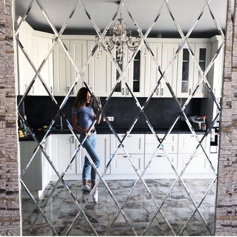 Нужно ли зеркало на кухне? Большинство скажет, что нет. Но это просто потому, что вы не видели наших примеров оформления кухни зеркальным панно. Вот вариант зеркального панно, выполненного из плитки «вытянутый ромб».